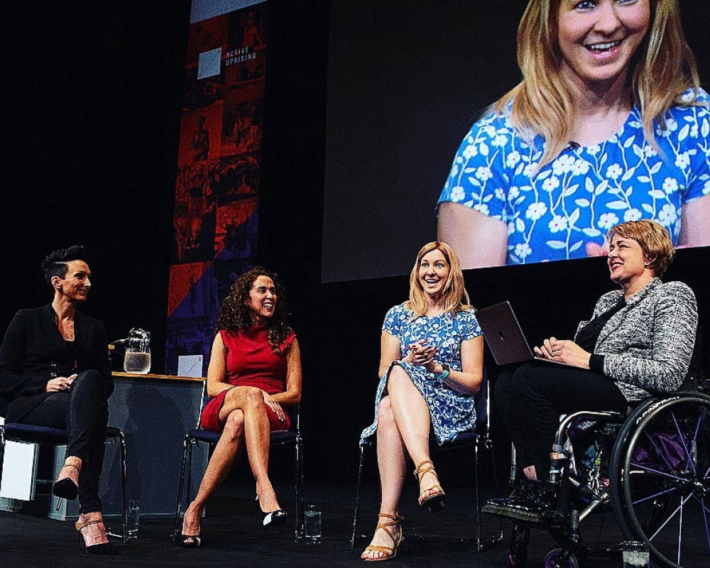 PHOTO: UK ACTIVE Panel. From right to left. Baroness Tanni Grey-Thompson, Olympic Winner and member of Parliament. Joanna Rowsell MBE, Team GB Olympic cyclist winner. Elena Lapetra Stronger co-founder and Sophie Lawler CEO Total Fitness gyms.